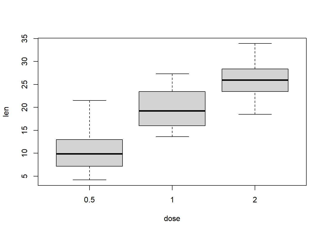 boxplot(len ~ dose, data = teeth)