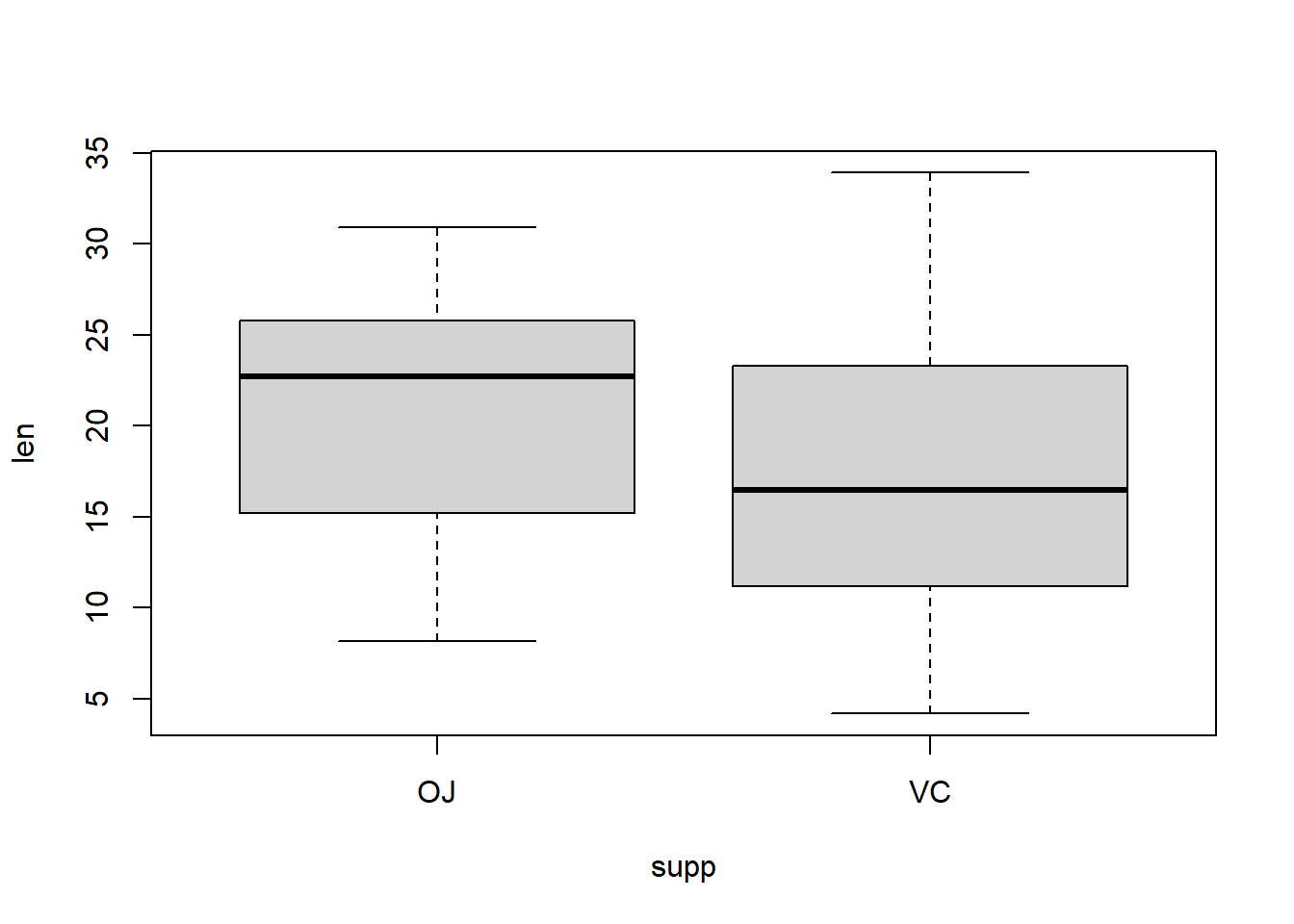 boxplot(len ~ supp, data = teeth)