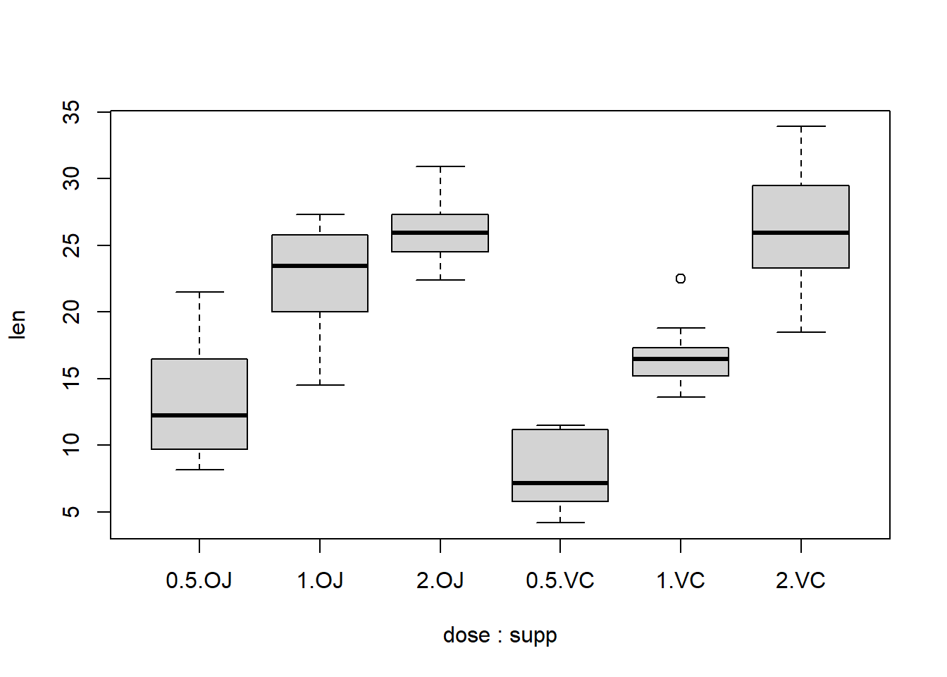 boxplot(len ~ dose + supp, data = teeth)